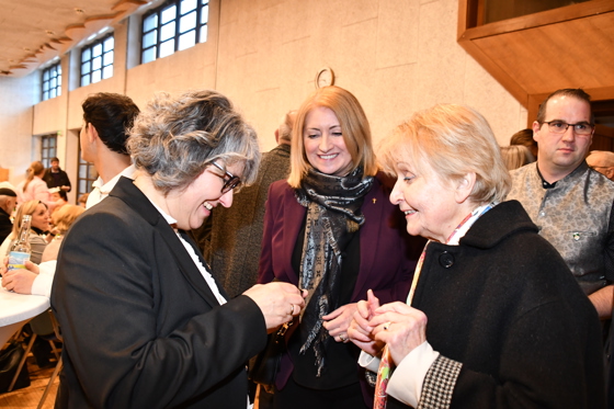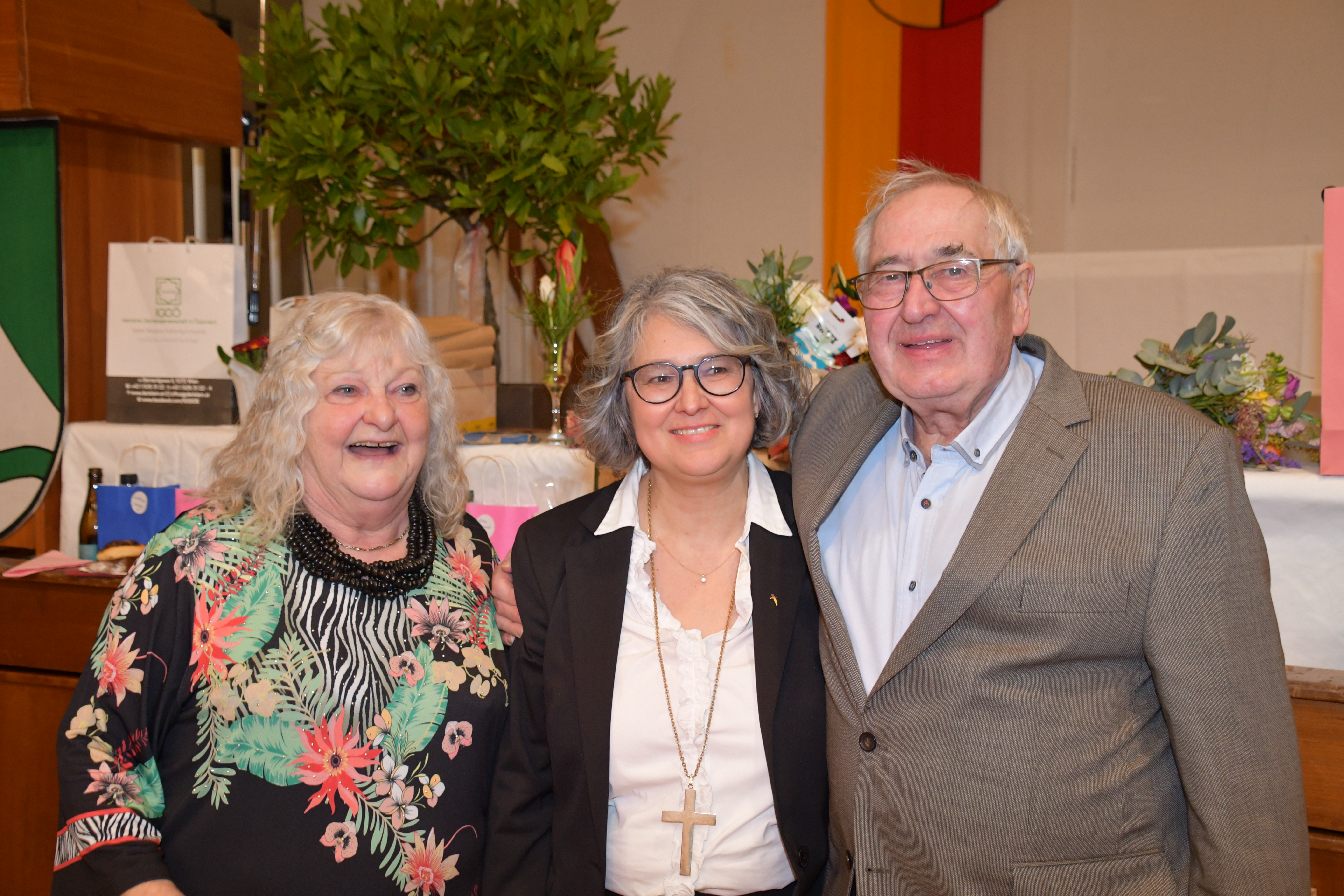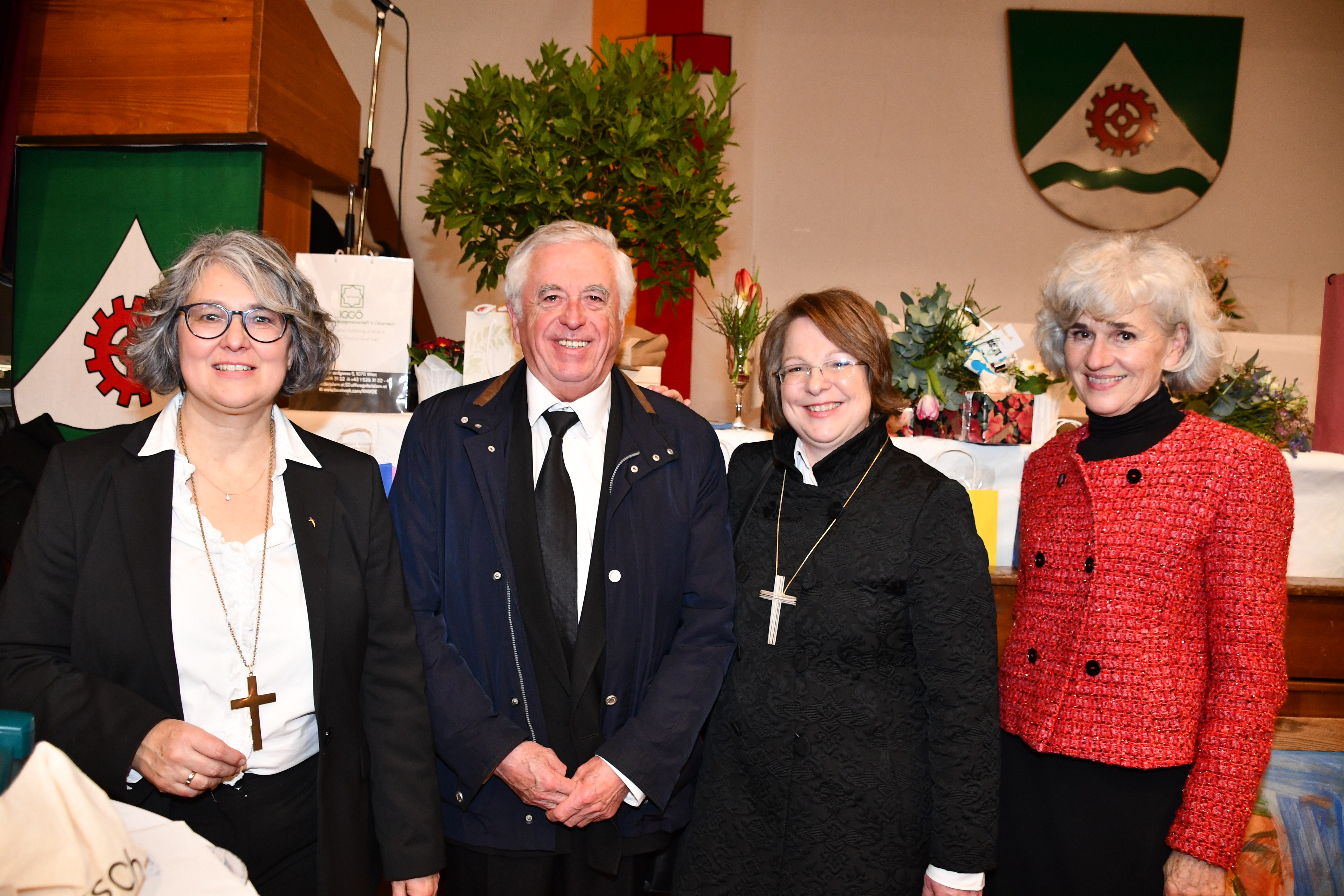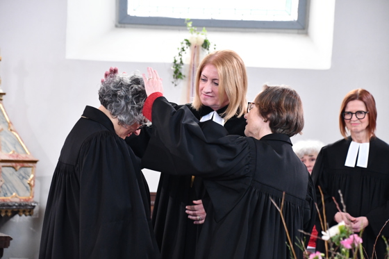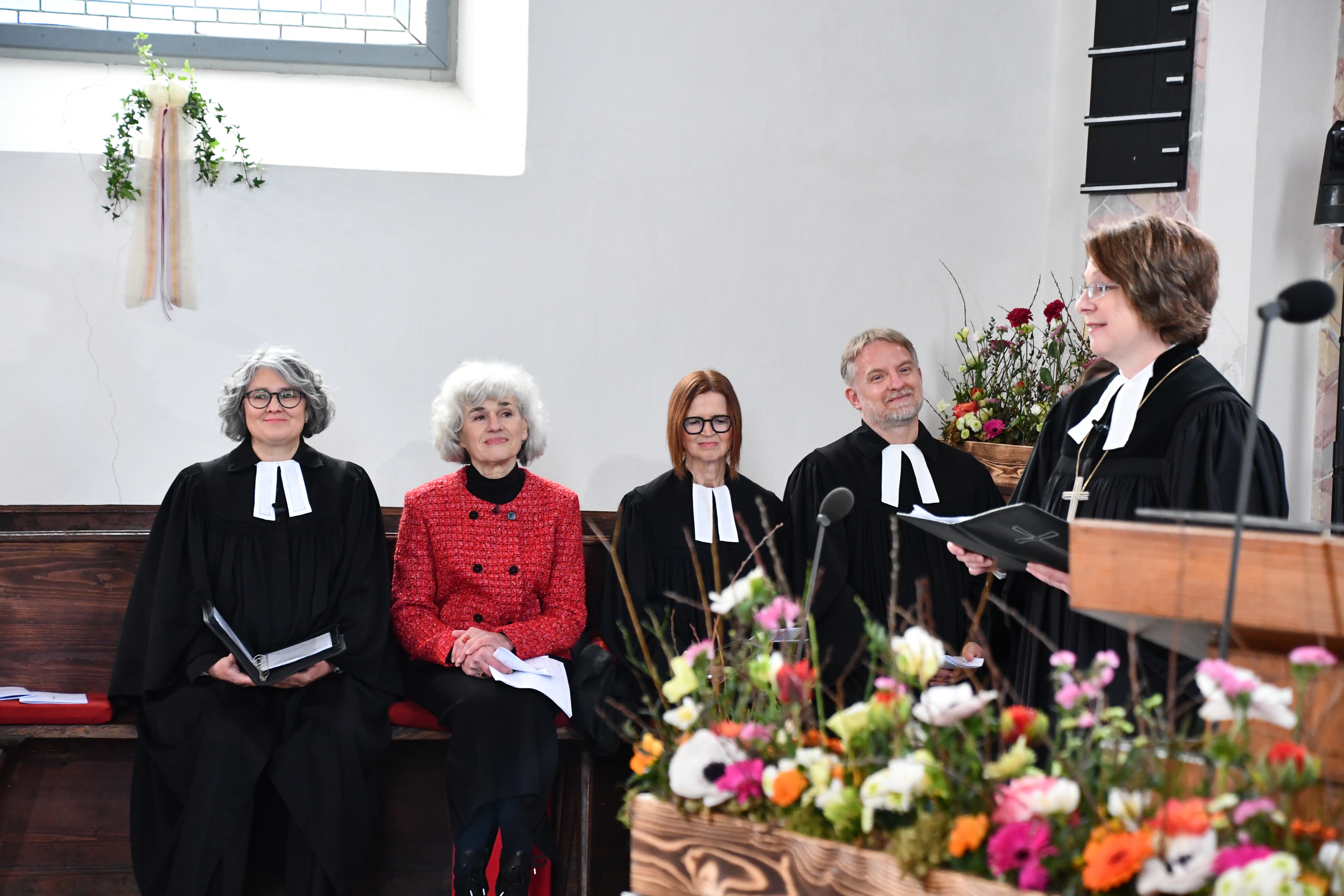 | Andrea Mattioli mit ihren Vorgänger von der ev. Pfarre Zlan - Friedrich Meister - Bischöfin Cornelia Richter, Superintendentialkuratorin Margarethe Prinz-Büchl |