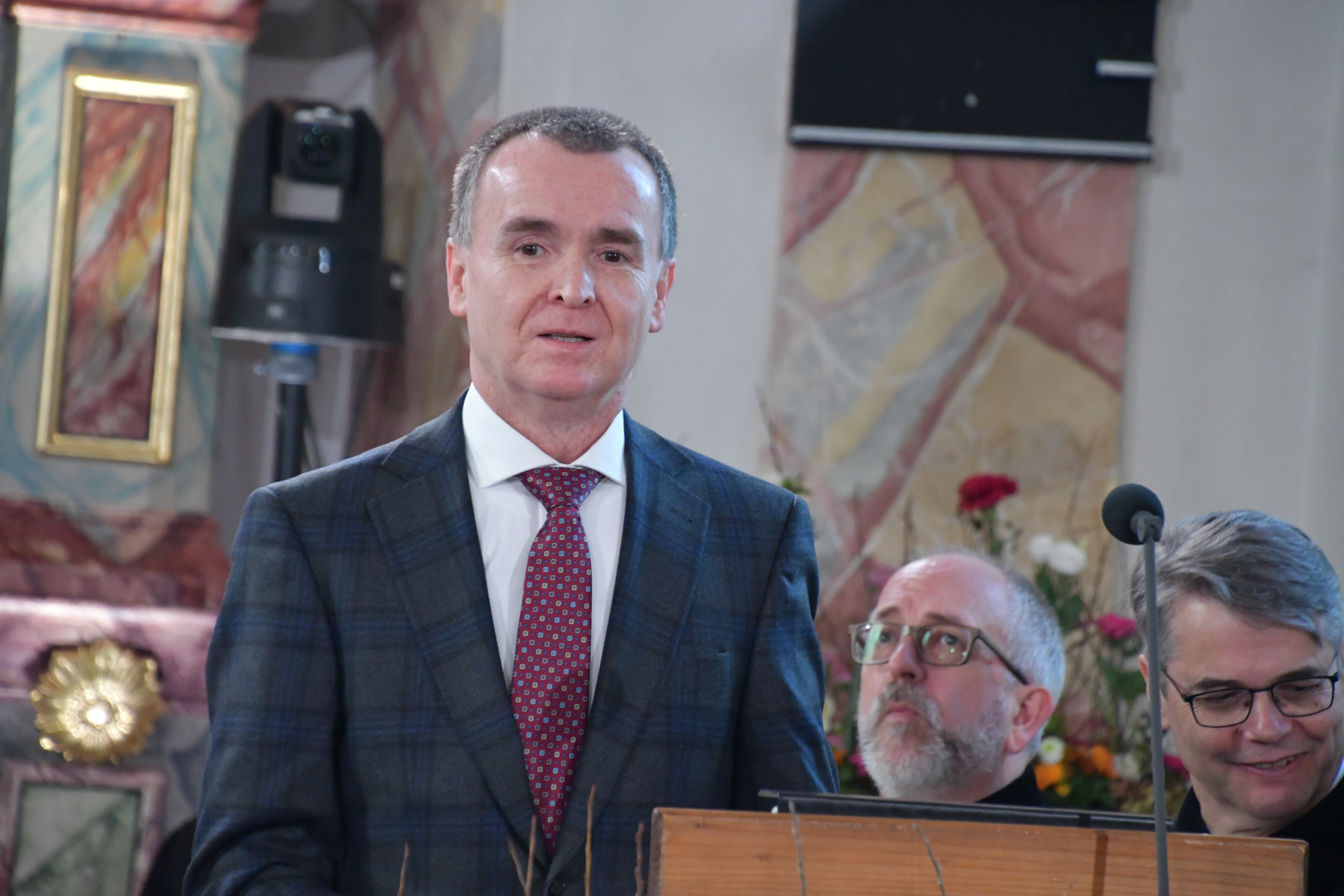| Kurator der ev. Kirche Zlan - Markus Torta - begrüsste unseren langjährigen Alt-Pfarrer ( 1994 - 2018 ) Friedrich Meister |